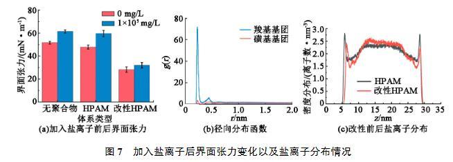 部分儲(chǔ)層中存在較高的礦化度,為此進(jìn)一步研究鹽離子對(duì)界面張力的影響。在3個(gè)體系的水相中分別加入質(zhì)量濃度為100 g/L的NaCl,觀察其對(duì)界面張力的影響情況,結(jié)果見圖7(a)??梢钥闯?,對(duì)于沒有聚合物存在的體系中,界面張力會(huì)隨著鹽離子的增加而增大。這是由于鹽離子的存在增大了水相的極性,從而拉大了油水兩相性質(zhì)上的差距,增大了油水界面張力。因此當(dāng)界面處的鹽離子增多時(shí),界面張力則會(huì)增大。加入HPAM的體系中也出現(xiàn)了類似的情況。然而引入磺酸基團(tuán)改性后的HPAM則受鹽離子的影響較小。為了解釋這一現(xiàn)象的物理機(jī)制,分析了帶電基團(tuán)周圍Na+分布(圖7(b))。通過計(jì)算徑向分布函數(shù)g(r),發(fā)現(xiàn)羧酸基團(tuán)周圍吸引了較多的Na+,導(dǎo)致Na+在聚合物附近聚集,而改性引入的磺酸基團(tuán)具有一定的抗鹽作用,其周圍分布的Na+數(shù)量更少。這也就導(dǎo)致2種體系界面附近Na+密度不同(圖7(c))。由于HPAM含有較多的羧酸基團(tuán),會(huì)引起Na+在聚合物附近的富集,導(dǎo)致界面張力的增加。而在加入改性HPAM后,引入的磺酸基團(tuán)對(duì)Na+的吸引力較弱,導(dǎo)致界面附近的Na+和改性前相比有明顯的減少,界面張力增加較少。因此加入磺化改性的HPAM在高礦化度下仍然可以保持較高的界面活性。