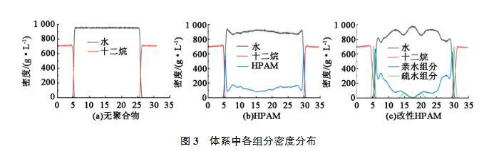 聚合物改變油水界面張力的本質(zhì)是油水界面特征的改變,為此分析各個(gè)組分在體系中的密度分布情況,結(jié)果見圖3。可以看出,在沒有聚合物的情況下,油水界面非常清晰,油相和水相處于完全分離的狀態(tài)。加入HPAM后,油相的分布幾乎沒有變化,而界面處水相密度變化的斜率略有減少,說明HPAM主要分布在水相中,在一定程度上減少了界面上水分子的數(shù)量。但由于HPAM和油相之間的相互作用較弱,因此并沒有改變油相在界面附近的分布情況。改性HPAM的加入對(duì)油水兩相的密度分布影響都較大,界面處油相密度變化的斜率減小,說明親油組分和油分子相互融合,從密度分布還可以看出由于聚合物的加入,油相和水相被聚合物顯著分離。