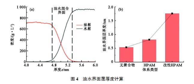 界面層厚度能夠反映油水界面處兩相的混合情況,一般來說界面厚度越大說明兩相之間的排斥越小,互溶效果越好,界面張力越低。參考Ricardo Paredes等的方法,選取密度低于油和水密度峰值90%的區(qū)域作為油水混合界面,如圖4(a)所示。計(jì)算得到的界面層厚度見圖4(b)。可以發(fā)現(xiàn),加入HPAM對(duì)于界面層影響很小,改性HPAM的加入可以大幅提高油水界面層厚度。這也反映出未改性HPAM油水界面依然比較清晰,兩相界限明顯,界面處油分子和水分子受力不均勻的現(xiàn)象依然嚴(yán)重;改性HPAM疏水基團(tuán)進(jìn)入油相中,引起z方向油水分布重疊區(qū)域變大,油水界面區(qū)域擴(kuò)展,油水界面變得凹凸不平,油水相的“螯合”加強(qiáng),界面處分子受力不均衡得到了緩解,有利于界面張力降低。
