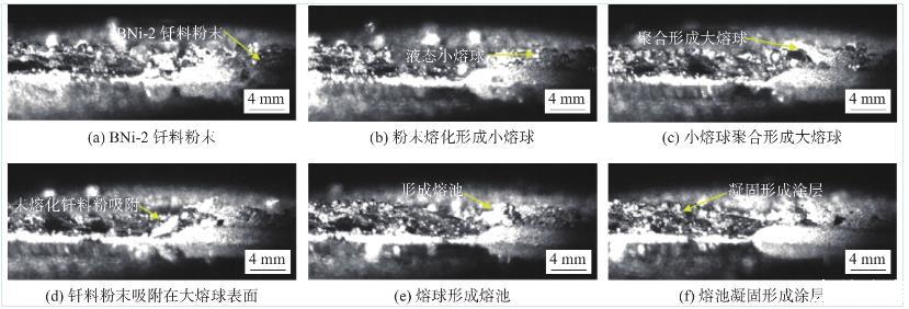 圖3是激光釬涂過程中的超高速攝影照片(4000幅/s),直觀地表征了激光釬涂過程中釬料粉末在激光作用下熔化、鋪展、凝固的過程。從圖3中可看出,在激光釬涂過程中,釬料呈現(xiàn)4種狀態(tài),分別為粉末態(tài)、熔球態(tài)、熔池態(tài)、凝固態(tài)。在激光未掃描的位置,釬料保持原始的粉末狀態(tài),如圖3a所示。被激光束掃到的位置,粉末態(tài)的釬料吸收能量,升溫熔化,形成尺寸較小的液態(tài)熔球,如圖3b所示。隨后,粉末釬料的不斷熔化形成更多液態(tài)小熔球,尺寸較小的熔球互相結(jié)合匯聚成尺寸較大的液態(tài)熔球,如圖3c所示。同時可觀察到未熔化的釬料粉末在液/固界面張力作用下,逐漸被吸附到尺寸較大的熔球表面,如圖3d所示。隨著激光逐漸向前掃描,熔球不斷長大,當熔球固相表面張力與重力的合力作用大于液/固界面張力后,大尺寸熔球在基體鋪展?jié)櫇?,形成熔池,如圖3e所示。最后,隨著激光熱源的移動,激光后端的熔池溫度逐漸降低,液態(tài)釬料逐漸凝固,在基體表面形成涂層,如圖3f所示。