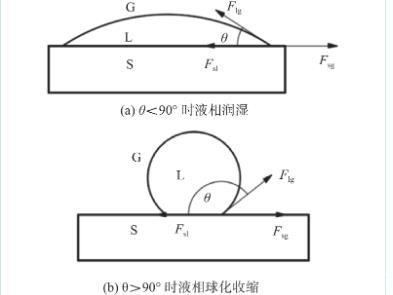 潤濕角θ的大小直接反映了液相對固體表面的潤濕程度,θ越小,潤濕性就越好。當θ為0°時,表示完全潤濕,小于時為潤濕狀態(tài),而大于時為不潤濕狀態(tài)。由于相同體積下,球形的表面積最小,表面張力驅(qū)使液體聚集到最小表面積狀態(tài),在釬料熔化后便聚合在一起收縮成球狀,從而發(fā)生液態(tài)釬料聚合現(xiàn)象。