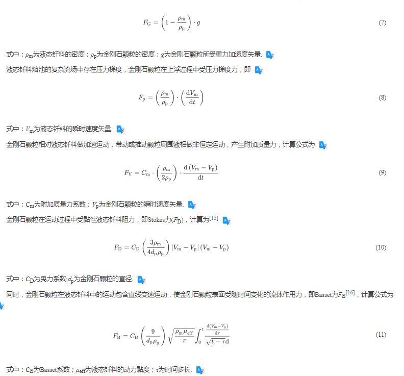 對于液態(tài)釬料熔池中存在復雜流場,金剛石顆粒上浮過程中存在重力和浮力的共同作用,計算公式為
