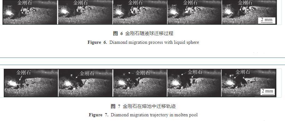 圖8為金剛石置于釬料底部時,金剛石在激光釬涂過程中運動軌跡??梢?,無論金剛石是直接鋪置于釬料表面,還是置于釬料底部,在釬涂過程中,金剛石均會上浮到涂層表層。具體過程為在激光熱源作用下,表層的釬料開始熔化成液態(tài)小球,由于金剛石的高透光性和高熔點,金剛石不會熔化。在液態(tài)小球聚集長大的過程中,金剛石沿著液球邊緣運動,當液態(tài)小球匯入大熔球時,金剛石繼續(xù)沿著大熔球的邊緣向表面運動,最后凝固于釬料涂層表層。