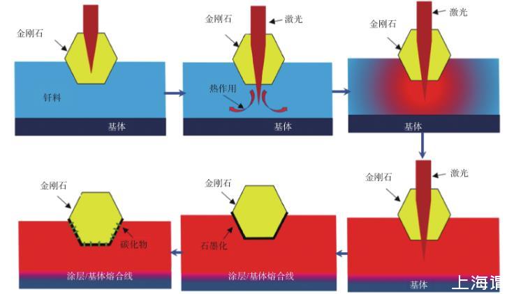 試驗所用激光波長為1.075μm,因此在激光釬涂過程中,激光會透射金剛石而直接加熱釬料,釬料吸收激光能量而迅速升溫、熔化,形成熔池。熔池熱量向金剛石傳導,潤濕金剛石,并誘導與熔池接觸的金剛石表面部分石墨化,與熔池中的Cr等元素發(fā)生反應,形成鉻的碳化物,增強了金剛石與釬料之間的冶金結(jié)合強度。釬料直接受熱升溫,金剛石被釬料熱傳導后吸熱升溫。金剛石透射激光的高效低損傷熱作用特性會有效避免金剛石在釬涂過程中的過熱損傷,這是激光釬涂金剛石涂層的最大潛在優(yōu)勢之所在,金剛石透射激光的熱作用如圖13所示。