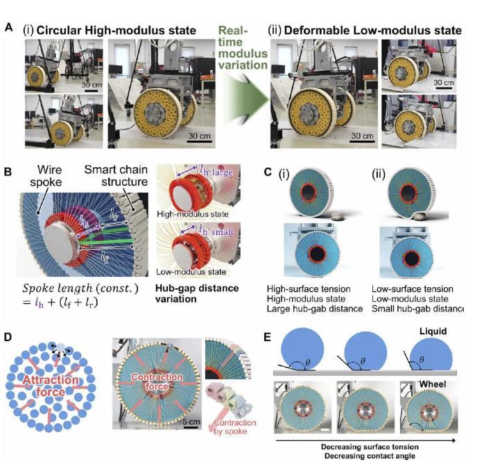 這是一個(gè)受液滴表面張力啟發(fā)的可變剛度輪。在液滴中,隨著最外層液體分子的內(nèi)聚力的增加,將液體分子向內(nèi)拉的凈力也增加。這導(dǎo)致高表面張力,導(dǎo)致液滴從引力引起的扭曲形狀恢復(fù)為圓形。同樣,車輪的形狀和剛度是通過(guò)改變最外層智能鏈塊的牽引力來(lái)控制的。隨著連接到每個(gè)鏈塊的鋼絲輻條張力的增加,車輪特性反映了一般圓剛輪的特性,這在正常平坦地面上的高速運(yùn)動(dòng)中具有優(yōu)勢(shì)。相反,隨著線輻條張力的減小,車輪的模量減小,并且根據(jù)障礙物的形狀,車輪容易變形。這使得輪子適合克服障礙物,而不需要復(fù)雜的控制或傳感系統(tǒng)。在此機(jī)理的基礎(chǔ)上,將輪子應(yīng)用于重達(dá)120 kg的兩輪輪椅系統(tǒng),實(shí)時(shí)實(shí)現(xiàn)了輪椅在室外環(huán)境中駕駛時(shí),圓形高模量狀態(tài)和可變形低模量狀態(tài)的狀態(tài)轉(zhuǎn)換。