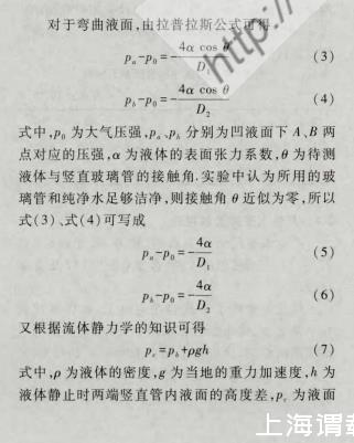 根據(jù)式(8),只需測(cè)量?jī)韶Q直管的直徑D1、D2以及管中凹液面的高低差h,便可以計(jì)算出待測(cè)液體的表面張力系數(shù)。