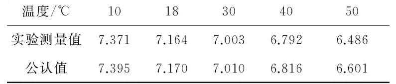 將不等徑U型管內(nèi)徑以及液位差的測量數(shù)據(jù)代入式(8)中,計(jì)算得到對應(yīng)溫度下的表面張力系數(shù)的測量值。查閱已有文獻(xiàn),可以得到不同溫度下純凈水表面張力系數(shù)的公認(rèn)值以及數(shù)據(jù)擬合出的公式α=75.45067-0.13326t-5.26468×10-4t2.實(shí)驗(yàn)測量值與公認(rèn)值對比列于表3.