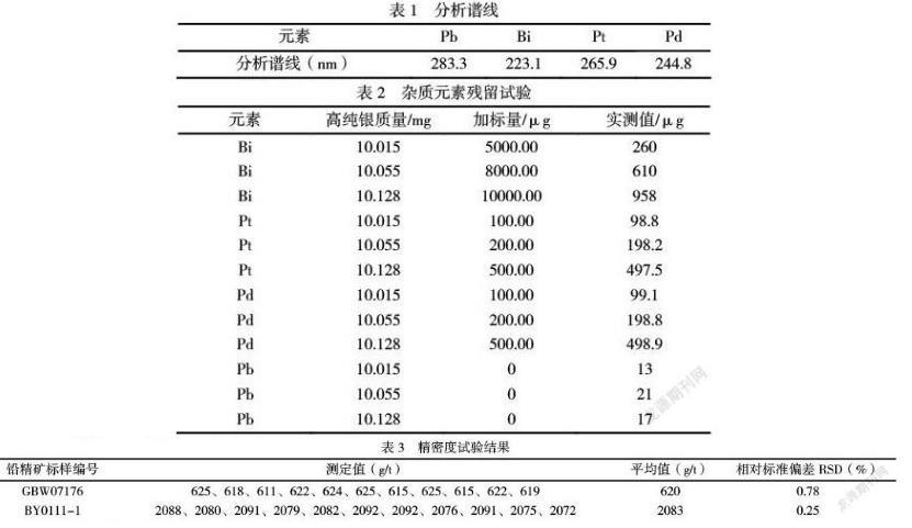 本方法中銀的含量是通過經(jīng)典重量法減去雜質(zhì)元素(鉛、鉍、鉑、鈀)和金所得,避免了高倍數(shù)的稀釋體積及苛刻環(huán)境要求帶來的誤差,分析結(jié)果準(zhǔn)確穩(wěn)定、精密度高,適用于鉛精礦中銀含量的測定,滿足行業(yè)分析需求。