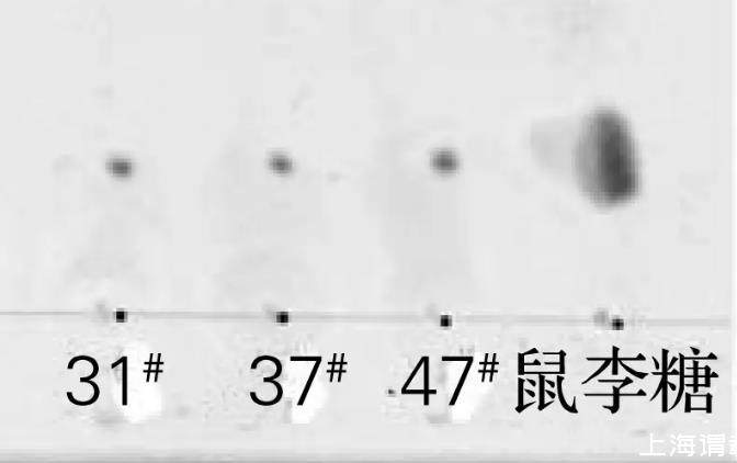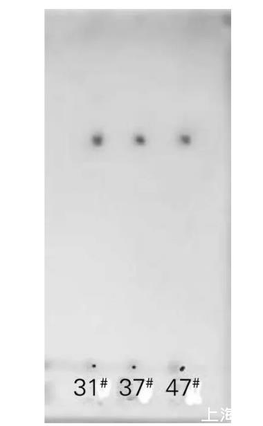 將菌株31#、37#和47#于30℃培養(yǎng)后,對發(fā)酵液萃取所得生物表面活性劑粗制品進行硅膠薄層層析,結(jié)果如圖4所示。將萃取所得生物表面活性劑粗制品進行酸解,硅膠薄層層析結(jié)果如圖5所示。