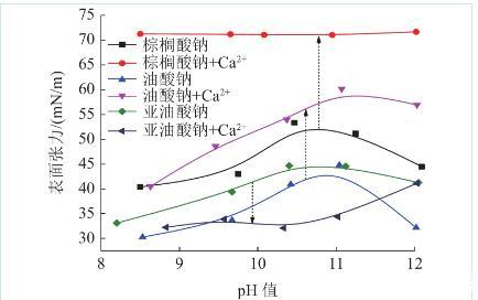 應(yīng)用鉑片法對(duì)溶液表面張力進(jìn)行測(cè)試,測(cè)試前使用乙醇和去離子水對(duì)測(cè)試玻璃皿進(jìn)行清洗,直至測(cè)定去離子水表面張力為72±0.2 mN/m。通過(guò)NaOH調(diào)節(jié)38 mL CaCl2溶液pH值,2 mL 4×10-3 mol/L脂肪酸鈉溶液被添加到CaCl2溶液并攪拌2 min,測(cè)量并記錄pH值,然后測(cè)量溶液表面張力。