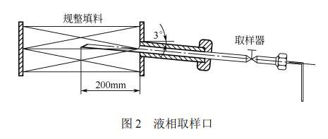全塔共設(shè)有4個取樣口。1#取樣口設(shè)在塔頂回流處;2#取樣口設(shè)在距填料底部1200mm處;3#取樣口設(shè)在距填料底部400mm處;4#取樣口設(shè)在填料段以下。填料段的取樣口,即2#、3#取樣口的樣式如圖2所示。取樣器沿水平方向向上傾斜3°放置,伸入填料段的部分為半圓管,長度為200mm,直徑為10mm。這樣設(shè)計以保證液相樣品順利地由填料中取出,且取出的液相樣品具有代表性。