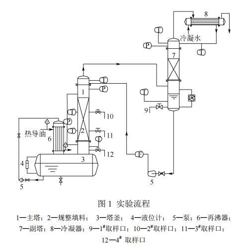 實(shí)驗流程如圖1所示。實(shí)驗裝置由主塔、副塔、冷凝系統(tǒng)、加熱系統(tǒng)四大部分組成。主塔為內(nèi)徑400mm的不銹鋼精餾塔,填料層裝填高度1.8m,每盤填料高200mm,共9盤。主塔塔頂上升蒸汽及其冷凝液在副塔內(nèi)進(jìn)行換熱,得到飽和的回流液,避免過冷現(xiàn)象的發(fā)生。塔釜再沸器采用熱導(dǎo)油加熱,換熱面積為27.5m2。塔頂冷凝器采用冷卻水制冷,換熱面積為29.9m2。實(shí)驗采用常壓下的全回流操作。