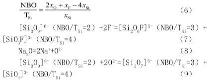 熔體表面張力與熔渣結(jié)構(gòu)的聚合程度密切相關(guān)。連鑄結(jié)晶器保護(hù)渣屬于硅酸鹽,硅酸鹽熔體中含有不同聚合程度的硅氧陰離子團(tuán)。熔渣結(jié)構(gòu)的聚合程度用符號“NBO/TSi”表示,其計算公式如式(4)所示。NBO/TSi值越小,說明熔體聚合程度越高。將預(yù)熔渣和靜滴法測定后的渣樣成分分別帶入到式(6)中,計算結(jié)果如表2所示。從表中可以看出,靜滴法測定后渣樣的NBO/TSi值小于預(yù)熔渣的NBO/TSi值,說明靜滴法測定后的渣樣熔體結(jié)構(gòu)聚合程度高于預(yù)熔渣熔體結(jié)構(gòu)聚合程度。這是由于F-能降低熔渣結(jié)構(gòu)的聚合程度,將高聚合程度的硅氧陰離子團(tuán)逐漸解聚成低聚合程度的硅氧陰離子,同時Na2O電解出O2-,O2-的出現(xiàn)亦可降低熔體的聚合程度,反應(yīng)式見(7)~(9):