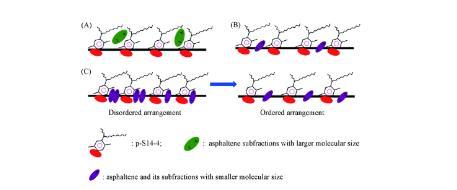 隨著時(shí)間的推移,界面上的活性分子由無序排列轉(zhuǎn)變?yōu)橛行蚺帕?,如圖6(C)所示。在此過程中,界面活性分子的脫附速率大于吸附速率,界面濃度不斷減小,導(dǎo)致IFT升高直到脫附速率等于吸附速率。因此,DIFTs曲線呈“V”型。在此情況下,IFTmin不等于IFTequ.結(jié)果表明,小分子尺寸的瀝青質(zhì)及其亞組分與P-S14-4分子的協(xié)同作用主要體現(xiàn)在瞬時(shí)的IFTmin值上。也可通過圖5證實(shí),隨著A,A3和A4濃度的增加,IFTmin明顯降低,這表明隨著分子尺寸較小的瀝青質(zhì)組分濃度的增加,混合吸附膜變緊密,協(xié)同作用增強(qiáng)。瀝青質(zhì)主要通過與表面活性劑形成混合吸附膜和改變油相的性質(zhì)來影響IFT。