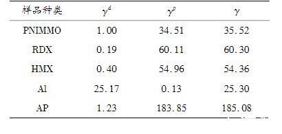 將表1中的接觸角測試結(jié)果代入式(2)中,利用Owens——Wendt——RabelandKaelble(OWRK)擬合得到PNIMMO及推進劑組分的表面張力,如表2所示。5種樣品的表面張力大小順序為:γ(AP)>γ(RDX)>γ(HMX)>γ(PNIMMO)>γ(Al),其中PNIMMO、RDX、HMX和AP中表面張力的極性分量γp均遠大于色散分量γd,說明其表面張力中極性分量貢獻更多;而相反Al粉表面張力中色散分量對其表面張力作主要貢獻。一般而言,當粘合劑的表面張力小于推進劑中單質(zhì)固體組分的表面張力時,粘合劑才能較好地包覆于推進劑表面。PNIMMO的表面張力為35.52mN/m,明顯小于RDX、HMX及AP的表面張力,說明PNIMMO比較容易鋪展于其他固體物質(zhì)表面。即PNIMMO對RDX、HMX和AP3種固體組分的包覆效果良好。