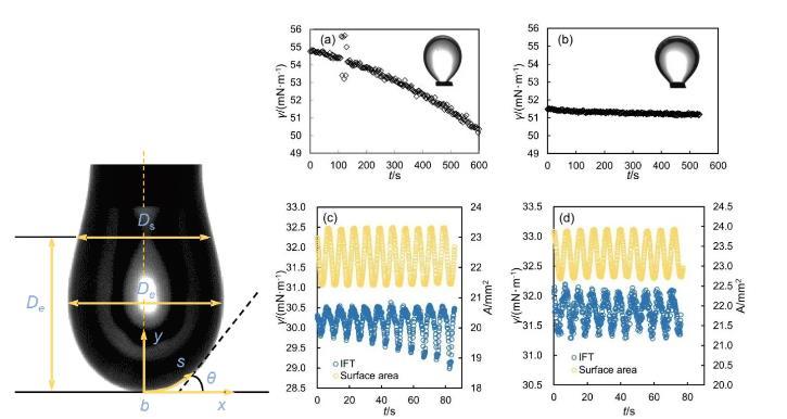 研究團(tuán)隊(duì)優(yōu)化了從樣品預(yù)處理、儀器改進(jìn)、實(shí)驗(yàn)測量到數(shù)據(jù)分析的全流程,提供了詳細(xì)的實(shí)驗(yàn)操作指南,涉及液滴控制、系統(tǒng)校準(zhǔn)和光學(xué)干擾處理等關(guān)鍵步驟。通過對(duì)氣水兩相和氣水油三相體系實(shí)際測量的有效數(shù)據(jù)和無效數(shù)據(jù)的展示和分析,驗(yàn)證了方法的有效性和準(zhǔn)確性。整套實(shí)驗(yàn)流程可基于不同實(shí)際條件在數(shù)天內(nèi)完成。圖2動(dòng)態(tài)懸滴表征(左圖);界面張力及界面流變性實(shí)驗(yàn)測量數(shù)據(jù)(右圖)本研究為界面性質(zhì)的測定樹立了新的標(biāo)準(zhǔn),通過優(yōu)化動(dòng)態(tài)懸滴表征方法,極大地提高了測量的可靠性和精度,體現(xiàn)了方法學(xué)創(chuàng)新;不僅對(duì)界面科學(xué)的基礎(chǔ)理論發(fā)展具有重要推動(dòng)作用,同時(shí)為材料科學(xué)、化學(xué)工程、環(huán)境科學(xué)等領(lǐng)域的實(shí)際應(yīng)用提供了技術(shù)支撐。