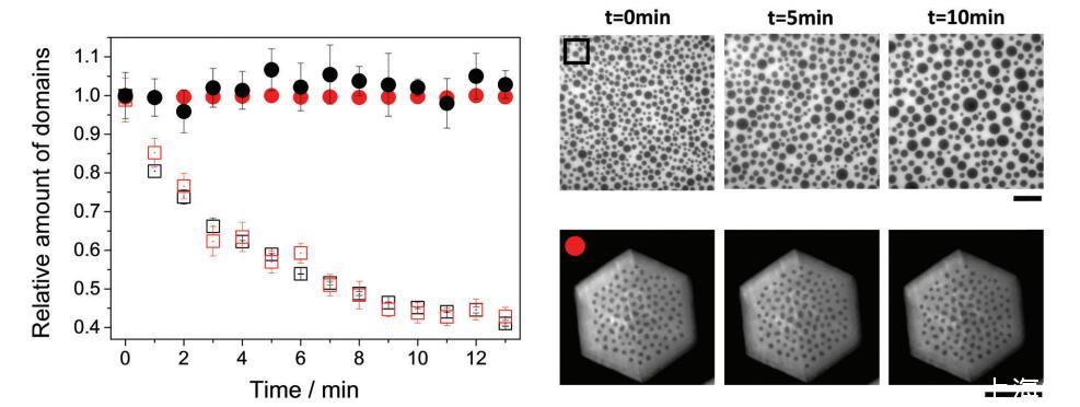 圖 5 帶電(圓形)和中性(方形)雙層(紅色)或單層(黑色)的域相對數(shù)量與時(shí)間的關(guān)系。 這些圖像是一個(gè)例子 中性單層(上)和帶電(下)雙層在指定時(shí)間。 圖像中包含的符號對應(yīng)于圖像中的相同符號 形象的。 比例尺對應(yīng)于 50 毫米。