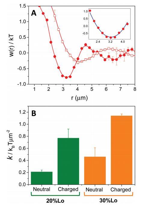 圖 4 (A) 域之間的平均力勢 w(r) 從 由帶電(圓圈)或 中性(正方形)域。 插圖:擬合實(shí)驗(yàn)的例子 數(shù)據(jù)(藍(lán)色曲線)對應(yīng)于 20%Lo 的帶電域。 (B) 春天 諧波電位常數(shù),通過擬合 w(r) 的第一個(gè)谷值獲得 為中性和帶電雙層的二次函數(shù)(見 A 中的插圖) 以指定的液體順序百分比。