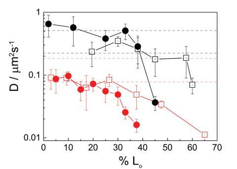 圖 2 擴(kuò)散系數(shù)(D)的實(shí)驗(yàn)值 小域 (1–3 mm) 作為面積百分比的函數(shù) 由液體有序相。 正方形代表中性系統(tǒng)和 環(huán)繞帶電系統(tǒng)。 黑色符號對應(yīng) 氣水界面處的單層和雙層的紅色符號。 虛線對應(yīng)于計(jì)算的 Dt 值的范圍 域大小的范圍,使用方程 (2) 或 (3)。 實(shí)線只是畫的 引導(dǎo)眼睛。