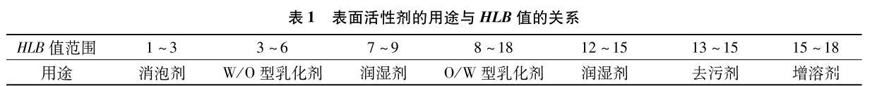 HLB值可用來衡量表面活性劑的親水親油性的大小,HLB值越大代表親水性越強,HLB值越小代表親油性越強,HLB值的轉(zhuǎn)折點為10,HLB值大于10一般為親水性,HLB值小于10為親油性,人們一般以HLB值為標(biāo)準(zhǔn)指導(dǎo)表面活性劑的實際應(yīng)用(見表1)。