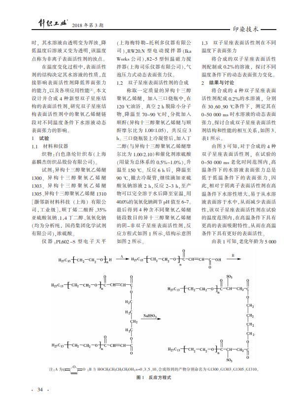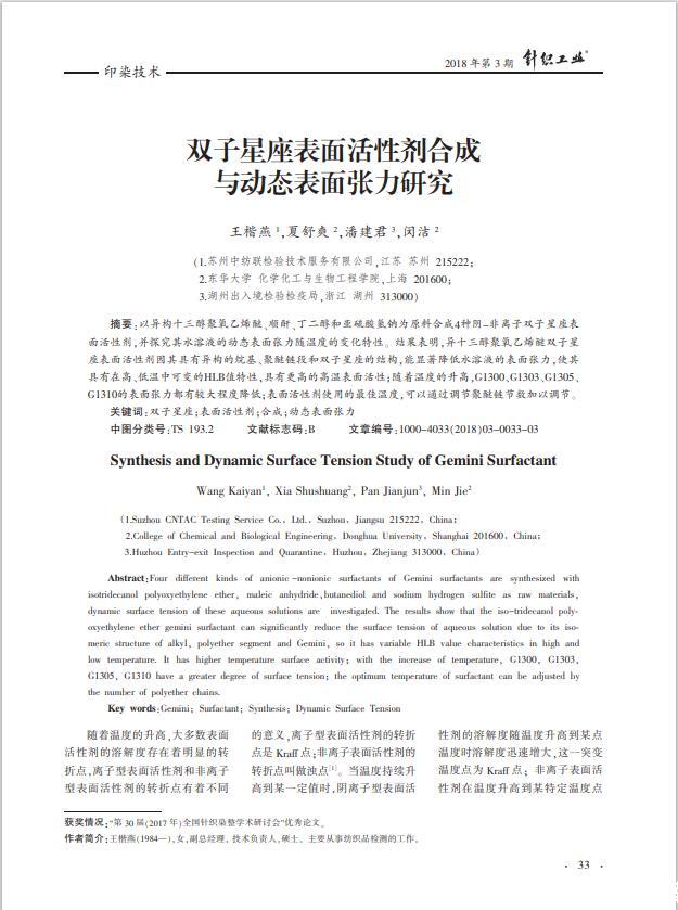 以異構十三醇聚氧乙烯醚、順酐、丁二醇和亞硫酸氫鈉為原料合成4種陰-非離子雙子星座表面活性劑,并探究其水溶液的動態(tài)表面張力隨溫度的變化特性。結果表明,異十三醇聚氧乙烯醚雙子星座表面活性劑因其具有異構的烷基、聚醚鏈段和雙子星座的結構,能顯著降低水溶液的表面張力,使其具有在高、低溫中可變的HLB值特性,具有更高的高溫表面活性;隨著溫度的升高,G1300、G1303、G1305、G1310的表面張力都有較大程度降低;表面活性劑使用的最佳溫度,可以通過調節(jié)聚醚鏈節(jié)數(shù)加以調節(jié)。