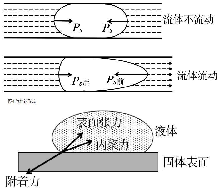 液體流動(dòng)時(shí)會(huì)受到液體中氣泡的阻礙作用。若流管較細(xì)且液體中氣泡較多時(shí)可能會(huì)因?yàn)闅怏w阻礙作用嚴(yán)重而造成流管堵塞,這種現(xiàn)象稱氣體栓塞,簡(jiǎn)稱氣栓。