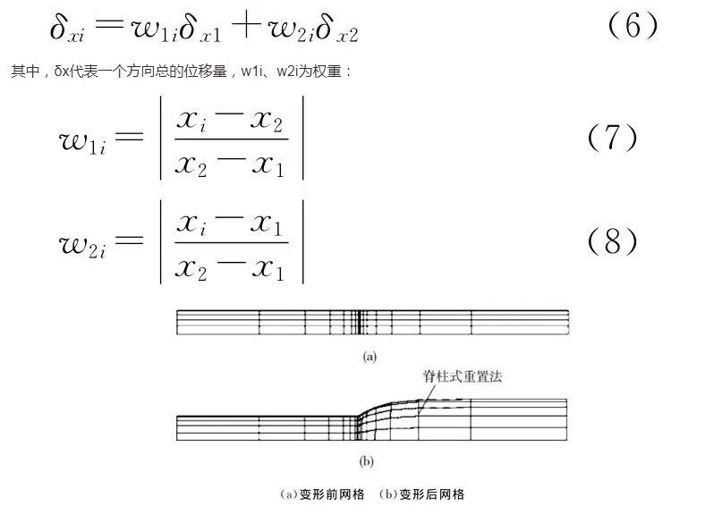 在數(shù)值模擬時,熔體自由表面在模擬的過程中會發(fā)生變形,自由表面的網(wǎng)格會因為自由表面位置的變化而發(fā)生變化。此時,需要采用網(wǎng)格重置技術(shù)。網(wǎng)格重置可以根據(jù)邊界點的位置的變化重新定位內(nèi)部網(wǎng)格節(jié)點。Spine法是一種比較簡單,適用于二維擠出成型的網(wǎng)格重置方法。其網(wǎng)格節(jié)點是沿著線性進(jìn)行重新組織的,如圖3所示。節(jié)點的位置確定是按照一維方式進(jìn)行邏輯排列的,這就像是對二維平面進(jìn)行切片,切片的方式是沿著自由表面或者移動邊界的法向方向,從而得到最終的網(wǎng)格。Spine法是線性組織的,并且在每個線段的端點處都有相應(yīng)的節(jié)點。假設(shè)x1、x2是線段的2個端點。按照Spine法的規(guī)則,內(nèi)部節(jié)點的位移數(shù)學(xué)表達(dá)式為: