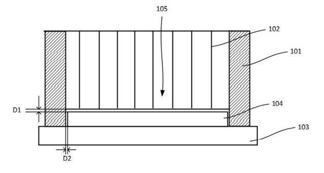如圖1所示,在一個實施例中,所述筒壁101與所述隔離網壁102的高度差為晶圓104高度加上5微米~500微米之和。當所述筒壁101被真空吸附臺103固定時,所述隔離網壁102與所述晶圓104表面的非接觸氣隙的間距D1為5微米~500微米,本發(fā)明的非接觸氣隙被配置為當腐蝕液進入某一個腐蝕區(qū)域105時,基于液體表面張力使得腐蝕液不會進入到相鄰的腐蝕區(qū)域105,可以避免隔離網壁102對晶圓104造成損傷,大大提高工藝穩(wěn)定性,同時,可以消除因晶圓104表面不平整導致的直接接觸造成高度差異而產生有的部分直接接觸的情況。