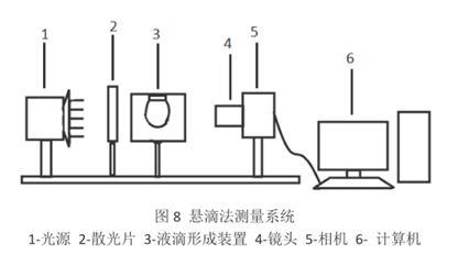 懸滴法的原理是利用液滴靜止懸掛在毛細(xì)管的管口處時,液滴的外形主要取決于重力和表面張力的平衡。通過測定懸掛著的液滴的外形參數(shù),可推算出液體表面張力。懸滴法的測量試驗系統(tǒng)主要由光源、散光片、液滴形成裝置、鏡頭、相機、計算機等組成。測試步驟也很簡單,不需要清洗儀器,制樣完成后,接通電源,調(diào)節(jié)控溫器使溫度達(dá)到預(yù)設(shè)溫度點。將裝好試樣的石英比色皿和注射器置于恒溫室中,針頭必須保持垂直。一般液體恒溫時間為 30 min??刂谱⑸浔眠M樣成滴,當(dāng)液滴接近最大直徑時,按動快門,記錄液滴圖像,將攝影膠片印制成圖像。該檢測方法表面張力測定精度也是±0.1% 。此外要注意管尖的口徑不能過大以致生成大懸滴,溫度波動會產(chǎn)生對流和振動,使懸滴不穩(wěn)定。