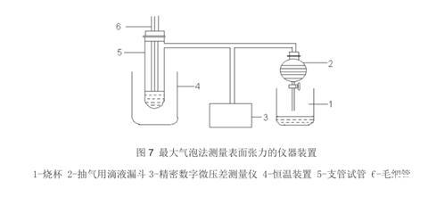 最大壓力氣泡法的原理是將毛細(xì)管端浸入液中,通過增加內(nèi)壓便產(chǎn)生氣泡,然后從管端成長的氣泡的最大泡壓可求出液體的表面張力。 最大壓力氣泡法使用的儀器主要為燒杯、抽氣用滴液漏斗、精密數(shù)字微壓差測量儀、恒溫裝置 、支管試管、毛細(xì)管等。檢測步驟當(dāng)然也先制樣,然后清洗儀器,之后檢驗儀器,調(diào)節(jié)毛細(xì)管或液面高度,使毛細(xì)管口與水面相切。打開活塞抽氣,調(diào)節(jié)抽氣速度,使氣泡由毛細(xì)管尖端成單泡出,且每個氣泡形成的時間約為 6s-10s。在形成氣泡的過程中,液面半徑經(jīng)歷:大→小→大,同時壓力差計指示值的絕對值經(jīng)歷:小→大→小的過程,記錄下絕對值最大的壓力差三次,取其平均值。最大壓力氣泡法每次測量前應(yīng)注意:一定要用待測溶液清洗支管試管和毛細(xì)管,并振蕩洗滌。