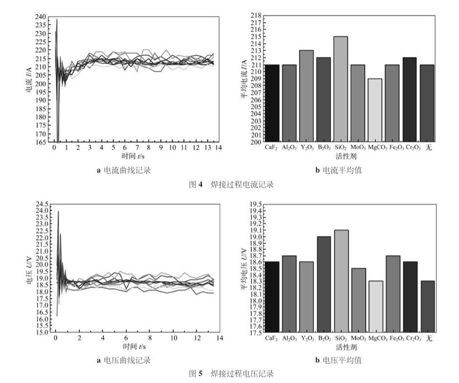 圖4為焊接過程中電流的記錄。從圖4a可以看出,焊接過程中各單一活性劑焊接電流曲線基本相似,從圖4b可以看出,大部分活性劑焊接過程的平均電流與無活性劑時相差不大,SiO2和MgCO3的電流平均值相比無活性劑時有較為明顯的變化,其中前者增加,后者減小。無活性劑時的平均電流達(dá)到211.5 A,而涂SiO2可以達(dá)到215 A。