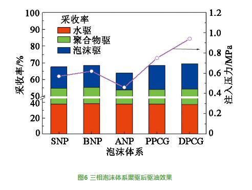 三相泡沫體系聚驅(qū)后驅(qū)油效果見圖6。由圖6可知,3支并聯(lián)巖心水驅(qū)采收率約為38%,聚驅(qū)采收率約為17%,聚驅(qū)后DPCG三相泡沫體系注入壓力和驅(qū)油效果最好,聚驅(qū)后采收率超過15%;PPCG體系次之,采收率超過14%。聚驅(qū)后SNP或BNP三相泡沫體系注入壓力和驅(qū)油效果相對(duì)較差,聚驅(qū)后采收率約為13%。聚驅(qū)后ANP三相泡沫體系注入壓力和驅(qū)油效果最差,但聚驅(qū)后采收率仍超過10%。
