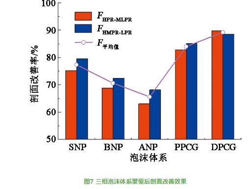三相泡沫體系聚驅(qū)后剖面改善效果見圖7。由圖7可知,不同三相泡沫體系在高滲與中低滲層的剖面改善率(FHPR-MLPR)高于63%,在高、中滲與低滲層的剖面改善率(FHMPR-LPR)高于68%,平均改善率大于65%。其中DPCG或PPCG三相泡沫體系的FHPR-MLPR和FHMPR-LPR最好(超82%),DPCG三相泡沫體系的FHMPR-LPR低于FHPR-MLPR。SNP、BNP或ANP三相泡沫體系的FHPR-MLPR和FHMPR-LPR相對(duì)較差,但其FHMPR-LPR好于FHPR-MLPR。