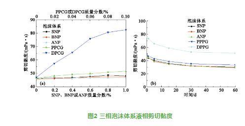 三相泡沫體系液相剪切黏度如圖2所示。由圖2(a)可知,隨著顆粒質(zhì)量濃度增加,DPCG三相泡沫體系液相的剪切黏度先快速增加,而后趨于平穩(wěn),而PPCG體系的剪切黏度僅略有增加。SNP、BNP或ANP對(duì)三相泡沫體系液相的剪切黏度影響較小。由圖2(b)可知,隨時(shí)間增加,不同三相泡沫體系液相的剪切黏度先快速降低,而后趨于平穩(wěn)。PPCG或PPCG三相泡沫體系液相剪切黏度保留率接近67%,SNP、BNP或ANP體系的保留率約為63%。