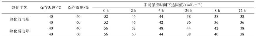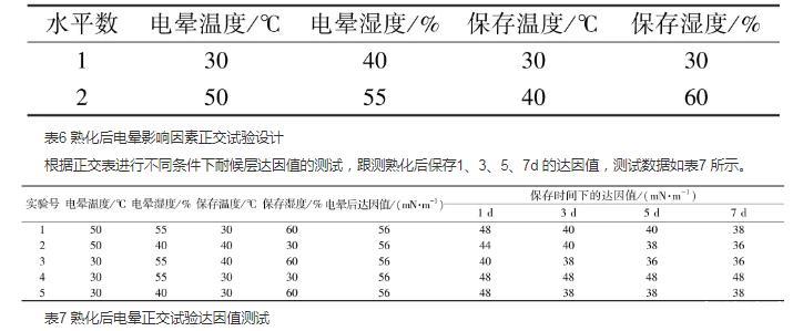 本文通過JMP軟件定制熟化前后電暈正交試驗(yàn)設(shè)計(jì),發(fā)現(xiàn)熟化溫度影響最顯著,熟化環(huán)境的濕度對(duì)耐候?qū)颖砻鎻埩τ绊懙诙@著,反應(yīng)程度第三顯著,電暈溫度無明顯影響。在40℃條件下,對(duì)熟化濕度進(jìn)行單因素分析,控制熟化濕度低于40%,基本上能使耐候?qū)颖砻鎻埩_(dá)到38 mN/m。熟化后電暈與熟化前電暈相比,在相同的保存時(shí)間內(nèi),熟化后電暈達(dá)因值較大。