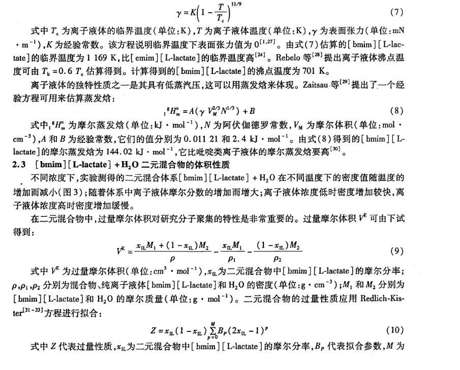 本次研究測(cè)定了不同溫度下手性離子液體[bmim][L-lactate]以及二元混合物[bmim][L-lactate]+H2O的密度和表面張力。結(jié)果表明,離子液體的密度和表面張力均隨著溫度的增加而減小;并且對(duì)純離子液體的熱膨脹系數(shù)、表面熵、表面焓以及其臨界溫度進(jìn)行了計(jì)算。研究了二元混合物的體積性質(zhì)(過(guò)量摩爾體積、偏摩爾體積、表觀摩爾體積、過(guò)量偏摩爾體積)、表面性質(zhì),發(fā)現(xiàn)二元混合物的密度隨溫度的增加而減小;所研究的二元混合體系的密度均隨著體系中離子液體摩爾分?jǐn)?shù)的增加而增大;混合物中手性離子液體與分子溶劑間具有強(qiáng)的相互作用。