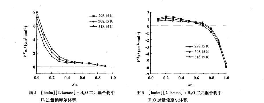 圖5[bmim][L-lactate]+H2 O二元混合物中IL過(guò)量偏摩爾體積