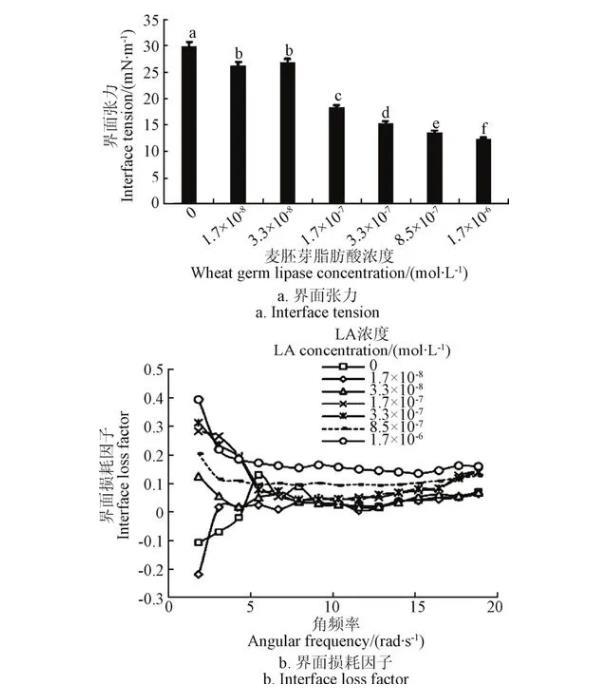 圖1b是不同濃度麥胚LA對油水界面損耗因子(tanδ)即損耗角正切值的影響。tanδ越大,耗散能量的能力越強(qiáng);由圖可見,tanδ隨麥胚LA濃度的增加而增加,當(dāng)麥胚LA濃度為1.70×10-6mol/L,tanδ值達(dá)到最大。該變化趨勢與界面張力變化趨勢有一定的相似性,原因可能是,麥胚LA濃度具有兩性特性,易富集在油水界面上。隨著其濃度的增加,導(dǎo)致界面黏度增加,進(jìn)而影響了因界面形變而耗散的能量。綜上,為了能夠觀察到明顯而準(zhǔn)確的試驗結(jié)果,在后續(xù)研究中選取麥胚LA的濃度為1.70×10-6mol/L。