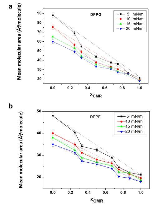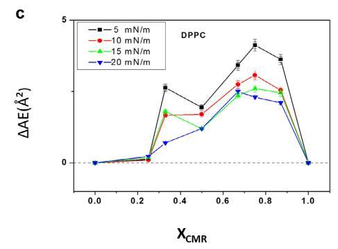 分子面積作為 CMR/ DPPG如圖5a所示。 可以看出負(fù)偏差 mma (XCMR = 0.33–0.67) 由于分子吸引力相互作用的增加。 CMR/DPPG 薄膜被認(rèn)為是部分混溶和非理想的浮動單層,因為線性度不高 觀察到的。 CMR/DPPE 混合薄膜的結(jié)果在 XCMR=0.25 和 0.67 時表現(xiàn)出不同的斷裂點(圖 5b)。 DAE 節(jié)目 包裝效率甚至幾何形狀的改進 調(diào)節(jié)發(fā)生在較低的 XCMR(圖 6)(Andrade 等人, 2006; 周和張,2000)。