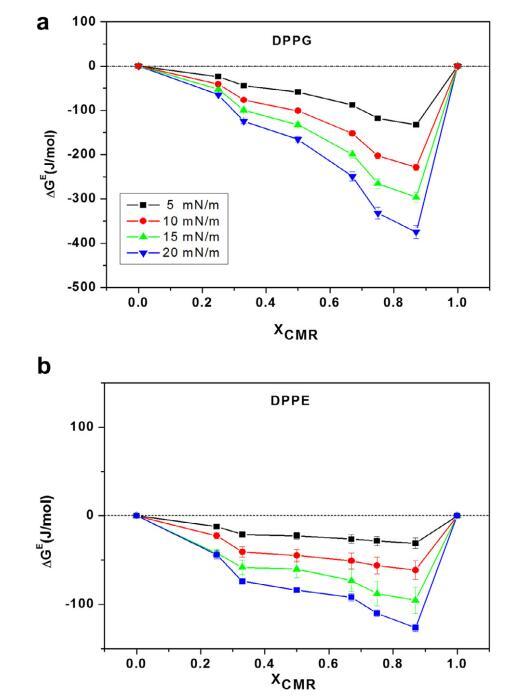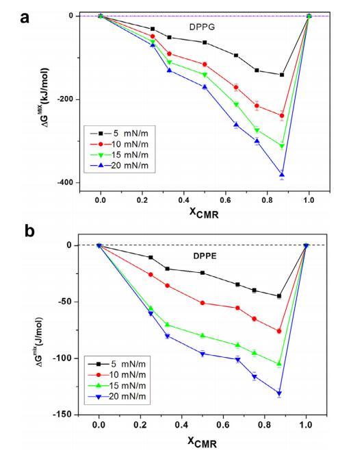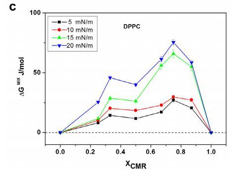 CMR/DPPG 混合膜的 ?Ge 和 ?Gmix 表示負(fù) 從 XCMR ≥ 0.25 到 XCMR = 1.0 的偏差(圖 7a 和 8a)。 ?Ge 和 ?Gmix 負(fù)值表明 CMR/DPPE 單層是 熱力學(xué)穩(wěn)定(圖 7b)。 ?Ge 和 ?Gmix 值為 DPPC 混合單層陽性,表明不混溶 (圖 7c 和 8c)。 分子之間的距離取決于 在導(dǎo)致排斥的磷脂頭部基團上 互動(邁爾斯,1999 年;博格斯,1987 年)。