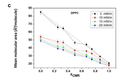 觀察到 CMR/DPPC 與 DAE 的正偏差 由于更不混溶的行為而導(dǎo)致的混合膜(圖 5c 和 6c)。 偏差程度取決于表面 壓力,因為在更高的壓力下,分子變得更多 包裝中分子間相互作用的影響變得不那么明顯(Chou 和 Chang,2000)。 令人厭惡的 行為表明相分離有利于分子聚集(Mishra 等,2012)。 得到了類似的結(jié)果 其他香豆素(Sarpietro 等人,2011 年;Chakraborty 等人,2012 年)。