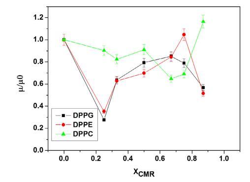 DPcoll 強烈依賴于混合的組成 單層并與 CMR 摩爾比成比例地減少。 從圖 1a 和 b 中提供的數(shù)據(jù)可以看出,在 由于加入了 CMR,xCMR = 0.87(DPPG)和 0.75(DPPE) 在這些單層上形成更有組織的狀態(tài)(Takao 等人,1995 年)。