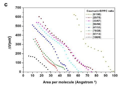作為函數(shù)分子面積 (ΔVA) 的表面電位為 如圖3a所示。 為所有研究的磷脂獲得的 ?V 值 與之前的報告相似(Andrade et al., 2006; Nowotarska 等,2014)。 ?V(460 mV 至 275 mV)逐漸降低 對于 DPPG,觀察到 CMR 摩爾分?jǐn)?shù)的函數(shù)。 ?V 易受極性和非極性基團的取向影響。