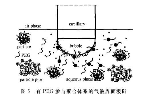 由圖3可見,有PEG參與的聚合體系。5rain的DST與圖2相比變化起伏較大,有先低后急升再緩降的變化模式,與一般的DST呈單調(diào)減小的趨勢(shì)有很大不同。這是因?yàn)樵诜磻?yīng)剛開始體系中除了單體、齊聚物和膠粒,又增加了PEG,而且PEG與齊聚物、膠粒作用形成粒子堆口]。PEG是完全水溶性物質(zhì),在體系水相中的濃度遠(yuǎn)遠(yuǎn)大于單體和齊聚物,但擴(kuò)散速率要小于單體及齊聚物,因此一開始部分新形成的氣液界面會(huì)由擴(kuò)散速率最快的單體迅速占領(lǐng),而隨時(shí)間推移PEG借助濃度優(yōu)勢(shì)會(huì)替代單體占據(jù)氣液界面,如圖5所示,最終達(dá)到平衡,由單體、齊聚物和PEG共同覆蓋整個(gè)氣液界面。PEG水溶液的氣液界面張力要比單體的氣液界面張力大得多,因此在水相中有大量單體存在的情況下,此聚合體系的DST會(huì)出現(xiàn)先低后急升的曲線形狀。這個(gè)狀況會(huì)一直持續(xù)到30rain時(shí),可以看出,PEG使體系直到30min時(shí)仍有大量游離單體存在于水相,而無(wú)PEG參與的體系此時(shí)已無(wú)單體游離在水相中。這一點(diǎn)可以從圖6轉(zhuǎn)化率一時(shí)間曲線得到證實(shí),無(wú)PEG參與的體系30min時(shí)已接近聚合終點(diǎn),而有PEG參與的體系轉(zhuǎn)化率才只有25左右。待反應(yīng)至50min時(shí),DST趨勢(shì)平穩(wěn),水相中游離的單體已經(jīng)很少,此時(shí)轉(zhuǎn)化率在49左右,說(shuō)明單體已基本進(jìn)入到膠粒中。這個(gè)狀態(tài)一直維持到60min時(shí)。75min時(shí)的體系有很大變化,從宏觀看粒徑發(fā)生轉(zhuǎn)變,由大變小。從DST曲線看氣液界面張力明顯提高,轉(zhuǎn)化率已快速增加到95,接近終點(diǎn)。此時(shí)體系中對(duì)DST的貢獻(xiàn)主要以脫離粒子堆的成熟粒子l3和PEG為主。
