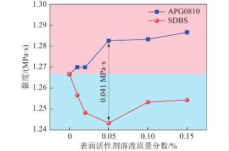 在質(zhì)量分?jǐn)?shù)為0.05%時(shí)兩種表面活性劑溶液黏度相差0.041 MPa·s,達(dá)到最大值,這是由于在該質(zhì)量分?jǐn)?shù)下SDBS溶液未形成膠束,且離子之間斥力最大,而APG0810溶液開(kāi)始形成膠束,溶液內(nèi)分子間碰撞概率變大。