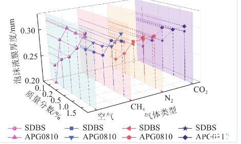 在溶液質(zhì)量分?jǐn)?shù)較高時(shí)SDBS溶液產(chǎn)生的泡沫液膜厚度有略大于APG0810的趨勢(shì),注入空氣條件下,質(zhì)量分?jǐn)?shù)0.15%時(shí)SDBS和APG0810溶液泡沫液膜厚度分別為0.321 mm和0.315 mm,兩者僅相差0.006 mm。這是由于隨著溶液濃度增大,APG0810已臨近臨界膠束濃度,而SDBS臨界膠束濃度大于APG0810,所以在質(zhì)量分?jǐn)?shù)為0.15%時(shí),APG0810溶液產(chǎn)生的泡沫液膜厚度已變化不明顯,而SDBS溶液泡沫液膜仍然有提高聚集水分子的能力,導(dǎo)致液膜厚度增加。
