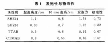 由表1可見:SHZ16的發(fā)泡性比SHZ14差,但穩(wěn)泡性要好于SHZ14,原因可能是隨著泡沫的生成,液體的表面積增加,表面能增加所消耗的能量增加,而且SHZ16的分子比SHZ14的大,那么單個(gè)分子的表面積就大,需要克服表面能消耗的能量也大,因此起泡性要差些而穩(wěn)泡要優(yōu)于SHZ14。