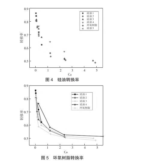 對不同黏度以及拉伸速度下的膠液進(jìn)行測量并計算轉(zhuǎn)移率,如圖4所示,在忽略慣性力的條件下,采用無量綱數(shù)Ca來表示轉(zhuǎn)移率,對于表面張力相似且不同黏度的四種甲基硅油的轉(zhuǎn)移率有著相似的收斂情況。為了進(jìn)一步印證Ca對轉(zhuǎn)換率的影響,引入與甲基硅油不同表面張力的環(huán)氧樹脂進(jìn)行對比實驗,如圖5所示,表面張力較大的環(huán)氧樹脂的轉(zhuǎn)換率會比甲基硅油小,但整體趨勢相差不大,均會收斂到一定數(shù)值。之后,為了了解慣性力對轉(zhuǎn)移率的影響,選擇黏度較小的膠液進(jìn)行實驗,同時加大移液針直徑使其脫離微量點膠的范圍,以提高慣性力對膠液傳遞的影響,如圖6所示,在通過增加膠液體積以提高慣性力影響的實驗中,膠液轉(zhuǎn)移率的變化與之前有極大差異。