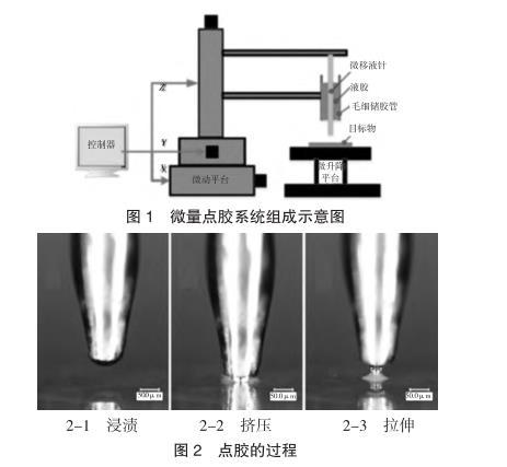 本課題組研制了一種基于移液針轉(zhuǎn)印原理的微量點膠系統(tǒng),該點膠系統(tǒng)所形成的膠斑直徑可達(dá)到數(shù)十微米,膠滴體積可達(dá)飛升-皮升的范圍。該系統(tǒng)的結(jié)構(gòu)如圖1所示。該系統(tǒng)由出膠單元、驅(qū)動單元和控制單元組成。其中,出膠單元為系統(tǒng)的核心,其主要包含微移液針和毛細(xì)儲膠管兩個關(guān)鍵元件,移液針通過在儲膠管內(nèi)的上下往復(fù)運動,實現(xiàn)膠液向基板的微量轉(zhuǎn)移。驅(qū)動單元由X/Y/Z三個方向的驅(qū)動電機(jī)和微升降平臺組成,用于驅(qū)動微移液針及點膠工件的運動??刂茊卧蒔LC控制系統(tǒng)和LaBview開發(fā)的控制面板組成,實現(xiàn)對電機(jī)運動的自動控制。