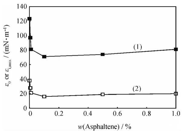 圖8含不同量瀝青質(zhì)的煤油-1750mg/L HMPAM水溶液體系的極限擴張彈性(ε0)和擴張黏性最大峰值(εi,max)
